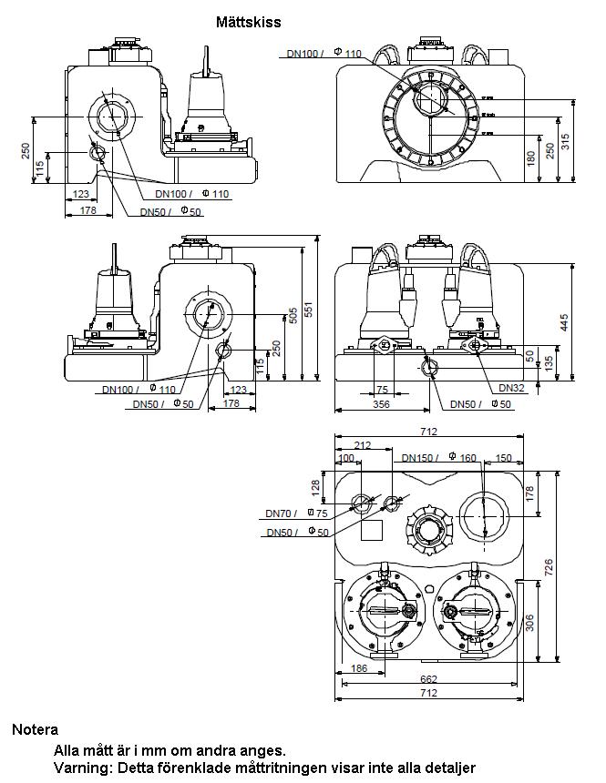 • DN100 och DN50 inlopp uttag på varje sida. DN150, DN50 uttag på toppen av tanken.