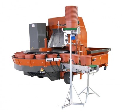 Javo Plus M2.0 Kruknings maskin med ett rund krukbord, lämplig för 10cm - 32cm krukor. Ändra krukkransen till passande krukstorlek kan justeras inom ett par minuter, på grund av det patenterade systemets justering. En välbalanserad dosering av Torv fyller krukorna i krukkransen oberoende på inställd storlek av kruka.