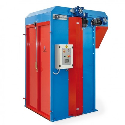 Enkelt att öppna dubbeldörren och rulla in pallen med den sammanpressade torven. Därefter stängs dörren och bufferten lyfter upp pallen stegvis.
