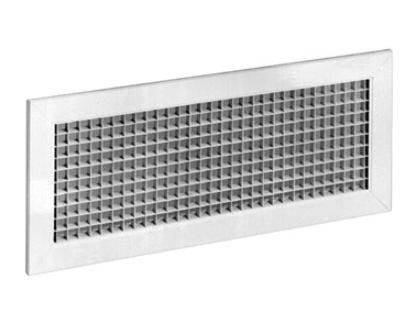 F20 är ett rektangulärt alumin iumgaller med kvadratiskt ras- ter. F20 kan användas för frånluft och levereras som stan- dard med fjäderklämmor för montering i tryckfördelningslåda typ VB A eller WB. På produktfotot visas gallret med VBA-låda.